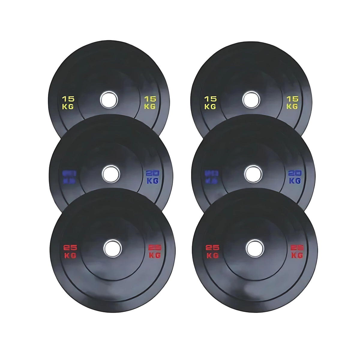 A complete set of premium rubber-encased bumper plates. The 120kg set includes: